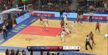 第三节结束,广东男篮以87-81领先6分,然而在末节邓蒙和朱旭航连续命中三分之后,双方打成了97-97平手。这个时候,离比赛结束还剩下最后的4分23秒,杜锋叫了暂停。暂停回来,两队陷入一片混战之中,谁也很难得分。