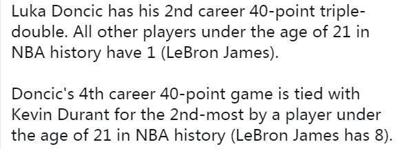 6.东契奇职业生涯第4次打出40+,追平了杜兰特,成为21岁之前砍下40+第二多的球员,第一的是詹姆斯在21岁之前8次砍下40+。