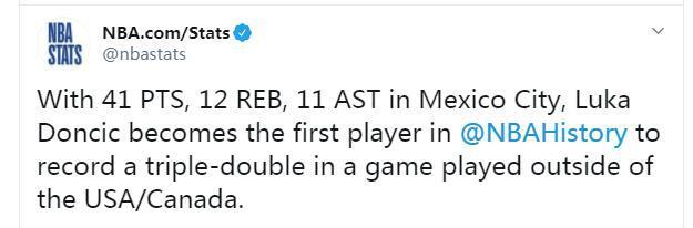 3.东契奇这次打出三双时,墨西哥城首次有NBA球员打出三双,同时也是首位NBA球员在美国和加拿大之外举办的常规赛砍下三双。