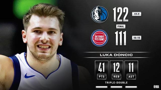 天下足球直播吧北京时间12月13日,独行侠和活塞在墨西哥城举行了一场比赛,东契奇再次打出火爆表现,出战34分钟轰下41分12篮板11助攻三双,率领独行侠120比111击败活塞。东契奇这一战刷爆7大纪录。